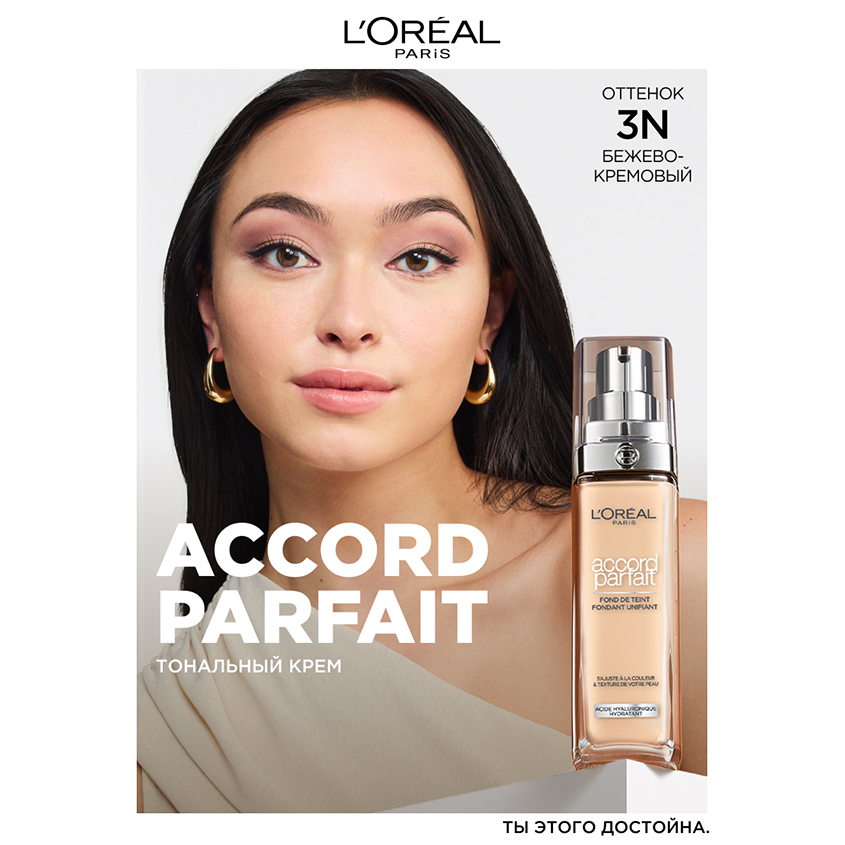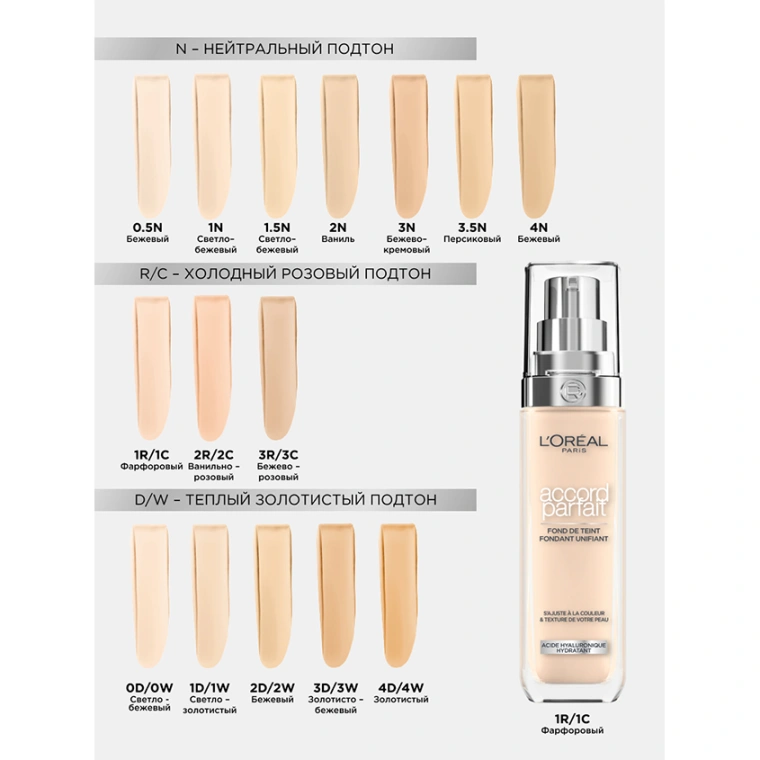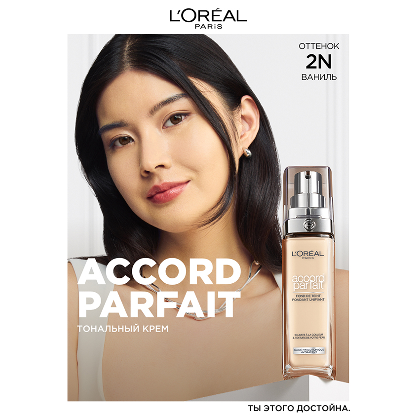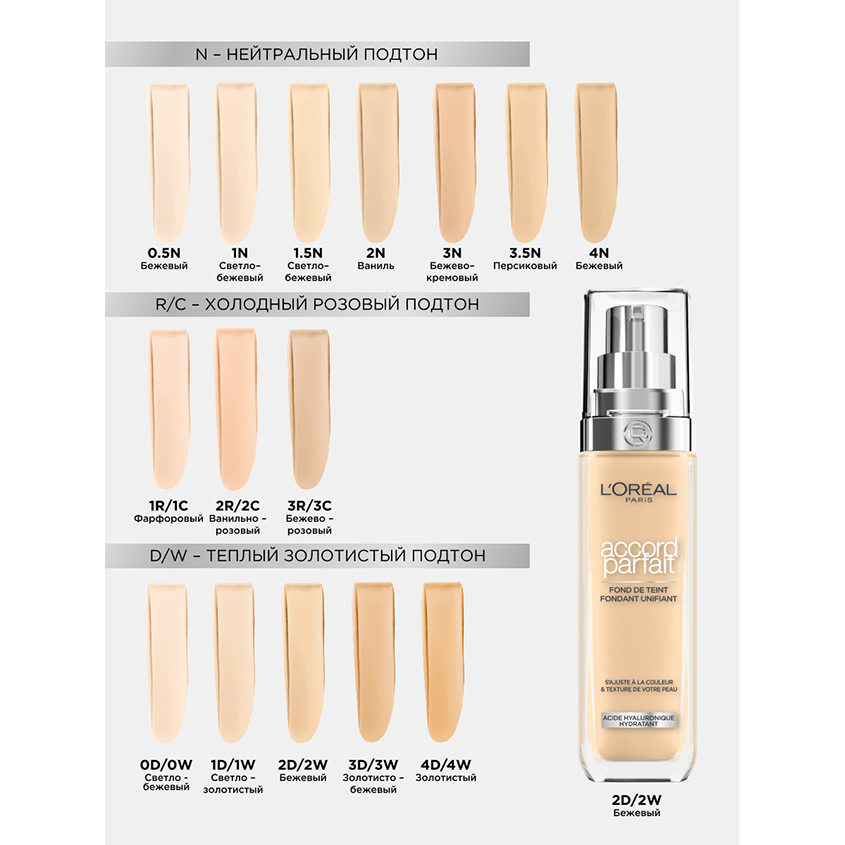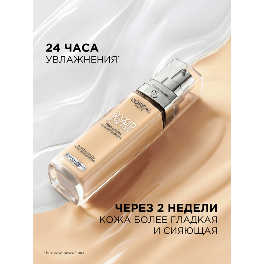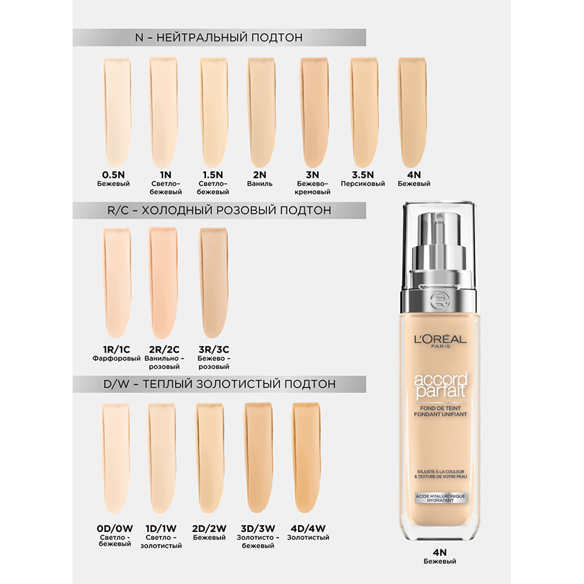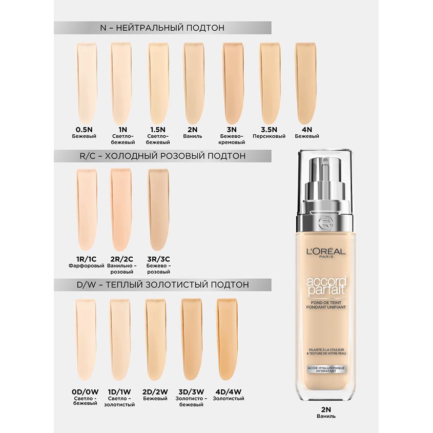 Жидкий тональный крем Accord Parfait от L'Oreal Paris выравнивает тон, подстраивается к цвету и текстуре кожи. Заметно преображает кожу за 2 недели применения: кожа более гладкая и сияющая. Ультра-тонкие пигменты подстраиваются под тон и подтон кожи. Формула на 80%, состоящая из увлажняющего крема с гиалуроновой кислотой. 24 часа увлажнения вашей кожи. Естественный финиш, сияющая кожа. SPF 16. КАК ПОДОБРАТЬ ТОН: номер обозначает интенсивность тона: от самого светлого 0.5 к темному 4. Буква обозначает подтон: N - для нейтрального подтона, R / C - для холодного розового подтона, D / W для теплого золотистого подтона. SPF 16