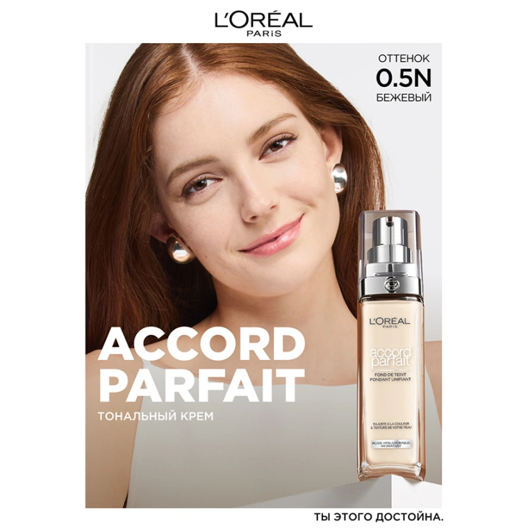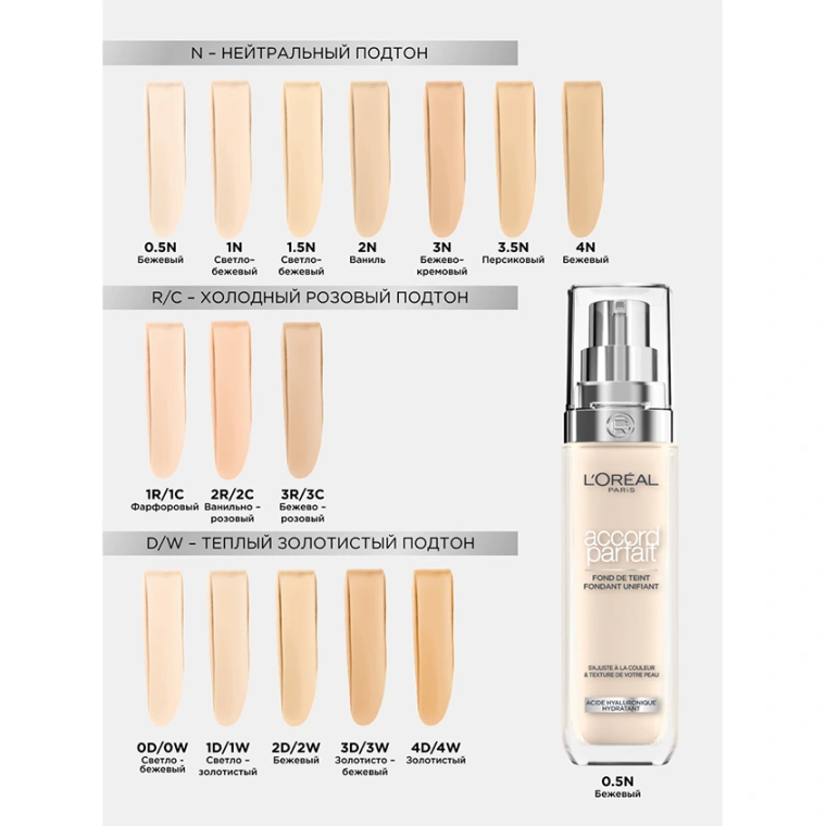 Жидкий тональный крем Accord Parfait от L'Oreal Paris выравнивает тон, подстраивается к цвету и текстуре кожи. Заметно преображает кожу за 2 недели применения: кожа более гладкая и сияющая. Ультра-тонкие пигменты подстраиваются под тон и подтон кожи. Формула на 80%, состоящая из увлажняющего крема с гиалуроновой кислотой. 24 часа увлажнения вашей кожи. Естественный финиш, сияющая кожа. SPF 16. КАК ПОДОБРАТЬ ТОН: номер обозначает интенсивность тона: от самого светлого 0.5 к темному 4. Буква обозначает подтон: N - для нейтрального подтона, R / C - для холодного розового подтона, D / W для теплого золотистого подтона. SPF 16