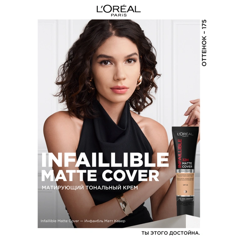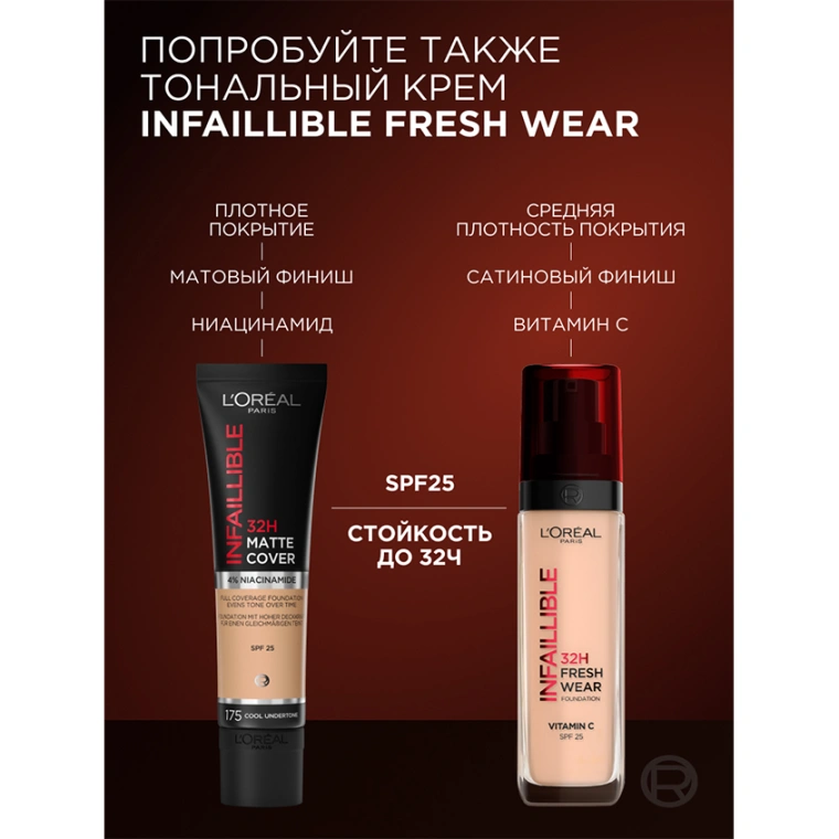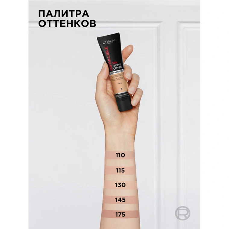 Матирующий cтойкий тональный крем Infaillible Matte Cover [Инфаибль Мат Кавер] 32 часа работает на твою кожу и заметно улучшает ее состояние. Он создает стойкое ровное матовое покрытие, без эффекта маски! Формула с 4% ниацинамида в составе выравнивает тон кожи и маскирует все виды кожных несовершенств. SPF 25. Невесомая текстура матирующего тонального крема легко наносится и равномерно распределяется на коже. Стойкий тональный крем Infaillible 32Ч Матовое Покрытие держится в течение всего дня, ощущается ультралегким и дышащим на коже.