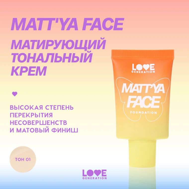 Крем тональный для лица `LOVE GENERATION` MATT`YA FACE матирующий с экстрактом матчи тон 01 Radiant ivory