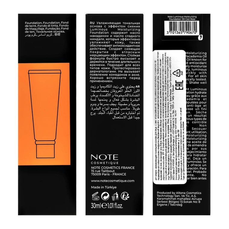 Основа тональная для лица `NOTE` LUMINOUS MOISTURIZING увлажняющая с эффектом сияния тон 130 Cool rose