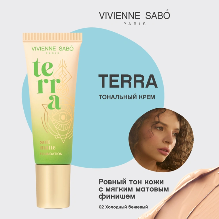 TERRA — тональный крем от VIVIENNE SABÓ с мягким матовым финишем. Он станет надежной основой твоего макияжа. Тональный крем воплощает в себе умиротворяющую атмосферу утренней прогулки в Люксембургском саду в Париже, куда ты приходишь отдохнуть от шумного города, зарядиться энергией природы и земли. Кремово-пудровая текстура ложится на кожу подобно утренней дымке, скрывая несовершенства и создавая покрытие от среднего до плотного с матовым финишем. Тональный крем в трех натуральных оттенках упакован в тубу с золотистым орнаментом, символизирующим одну из стихий. Безупречный французский стиль: финиш тонального крема TERRA сравним с нежной текстурой матовых розовых лепестков. Он эффективно поглощает излишки себума, не пересушивая кожу, и обеспечивает долговременный контроль над блеском. Результат — утонченный естественный образ, который сохраняется на протяжении всего дня.