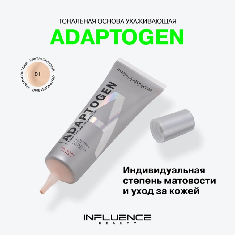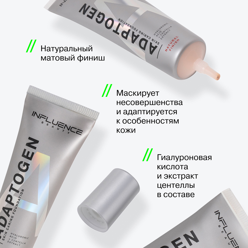 ADAPTOGEN от INFLUENCE BEAUTY — это уникальное сочетание декоративных свойств тональной основы с ухаживающими компонентами в составе для безупречного макияжа, идеального тона и заботы о вашей коже. Продукт с легкой жидкой текстурой равномерно распределяется и обеспечивает естественное покрытие с натуральным матовым финишем без эффекта маски. Крем разработан с использованием передовой технологии ADAPTOMATTE. Это революционный подход к созданию тональной основы, которая адаптируется к индивидуальным особенностям кожи. Интеллектуальные микропигменты в составе продукта обладают уникальной способностью «считывать» уровень влажности кожи и регулировать степень матовости. В сухих зонах они создают легкое полупрозрачное покрытие, позволяя коже дышать. А в более жирных зонах — плотное матовое покрытие, контролируя блеск. ADAPTOGEN содержит специальные матирующие частицы, которые разглаживают несовершенства кожи и создают натуральный матовый эффект мягкого фокуса. Тональный крем обеспечивает не только безупречное покрытие, но и уход благодаря составу с гиалуроновой кислотой и экстрактом центеллы. Компоненты предотвращают обезвоживание кожи, успокаивают ее, уменьшают покраснения и воспаления. ADAPTOGEN — это интеллектуальный продукт, который заботится о вашей коже и подчеркивает ее естественную красоту.