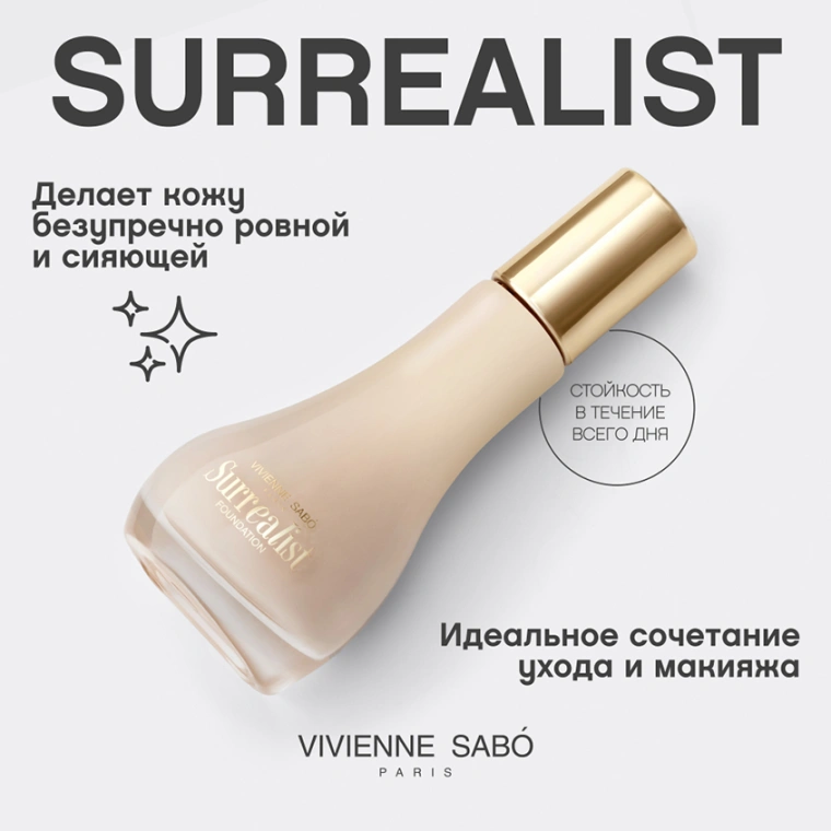 SURREALIST от VIVIENNE SABÓ — тональный крем, с которым ты погрузишься в сюрреалистический мир красоты. Сатиновый финиш, словно отражение лунного света, и сияние светоотражающих микрочастиц, будто прикосновение утренней зари, делают твою кожу безупречно ровной и чарующей, подчеркивают естественную красоту и молодость. Каждая капля SURREALIST — это искусство преображения. Вуаля! Одно движение — и твоя кожа становится гладкой, сияющей и идеальной, словно созданной в мечтах. Формула с питательными компонентами придает мягкость и увлажнение, а невесомая стойкая текстура скрывает несовершенства и создает среднее покрытие, которое можно наслаивать для плотного эффекта. Тональный крем в трех оттенках упакован в изысканный округлый флакон из стекла: он выглядит словно капля, застывшая в движении. С ним каждый макияж превращается в произведение искусства, где твоя кожа становится воплощением утонченной французской эстетики. SURREALIST от VIVIENNE SABÓ — ключ к миру красоты на грани реальности.