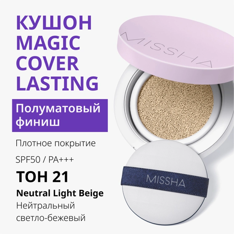 Кушон тональный для лица `MISSHA` MAGIC CUSHION COVER LASTING с устойчивым покрытием тон 21 Neutral light beige