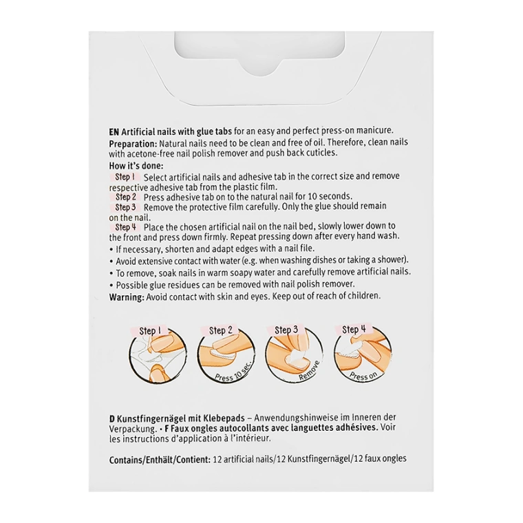 Натуральные ногти должны быть чистыми и обезжиренными. Очисти натуральные ногти жидкостью для снятия лака без ацетона и отодвинь кутикулу. Как это делается: 1. • Подбери искусственные ногти и клеевые пластинки нужного размера. Отклей клейкую ленту от пластиковой пленки. 2. • Прижми клеевую пластинку к натуральному ногтю в течение 10 секунд. 3. • Осторожно сними защитную пленку. На ногте должен остаться только клейкий слой. 4. • Приложи выбранный искусственный ноготь к ногтевому ложу, аккуратно опусти переднюю часть и плотно прижми. Прижимай накладной ноготь к ногтевому ложу после каждого мытья рук. При необходимости укороти ногти и скорректируй их форму с помощью пилочки. Избегай продолжительного контакта с водой (например, при мытье посуды или принятии душа). Для удаления погрузи ненадолго руки в теплую мыльную воду и осторожно сними искусственные ногти. Если на ногтях остался клей, его можно удалить с помощью жидкости для снятия лака.