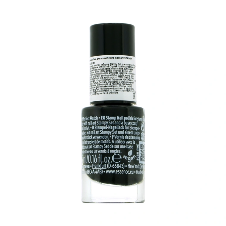 Лак для ногтей nail art STAMPY POLISH 01 Perfect match от essence идеально подходят для создания утонченного дизайна на твоих ногтях. Ты можешь нанести этот высоко пигментированный черный лак для ногтей поверх любого цвета лака и получить прекрасный результат даже при создании очень тонких узоров. Кстати, Сочетай лак для ногтей STAMPY POLISH 01 Perfect с набором для стемпинга STAMPY SET.
