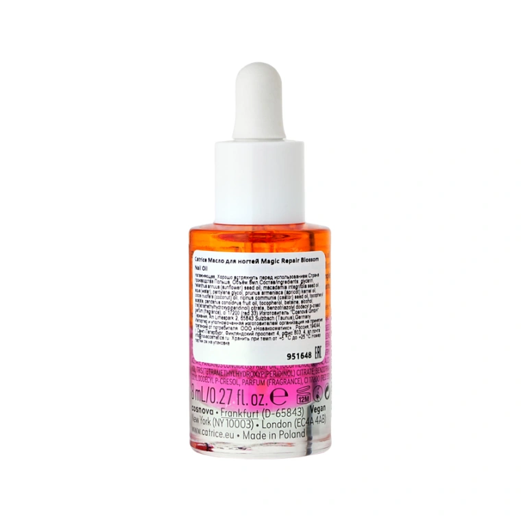 Увлажняющее масло для ногтей CATRICE MAGIC REPAIR Blossom Nail Oil — двухфазное средство, которое интенсивно питает, восстанавливает и укрепляет. Формула, обогащенная ухаживающими компонентами, проникает в самые глубокие слои ногтевой пластины, обеспечивая мгновенное увлажнение и смягчение кутикулы, защиту от расслаивания и ломкости, стимуляцию здорового роста ногтей. Яркое сочетание оранжевого и розового оттенков, а также восхитительный аромат цветов мгновенно поднимают настроение, обеспечивая роскошный уход за ногтями в домашних условиях. Масло CATRICE MAGIC REPAIR Blossom Nail Oil подходит для тех, кто хочет восстановить здоровье ногтей и сохранить кутикулу мягкой и увлажненной.