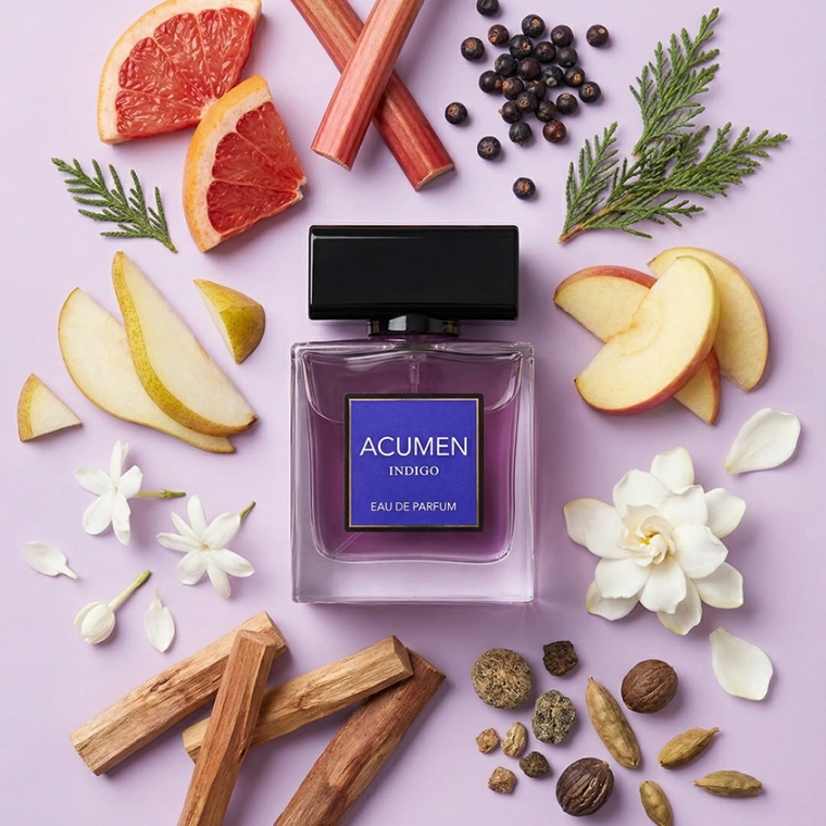 Открыть еще одно воплощение мужчины – загадочность и многогранность – именно для этого создан Acumen Indigo. Она никогда не угадает, где вы сегодня проведете совместный вечер: на крыше небоскреба или на манящем побережье, в уютном кафе или под проливным дождем. Именно такого мужчины ей не хватает рядом – полного сюрпризов и новых идей. Аромат в первых нотах раскрывается манящей свежестью грейпфрута и ревеня, окруженной терпкими ягодами можжевельника и кипарисом. Затем характер его резко меняется – погружается в томную сладость фруктов и белых цветов. Идеальным завершением аромата стало звучание восточных нот сандалового дерева и мускуса.