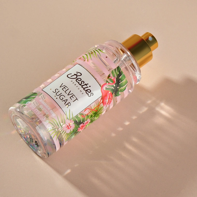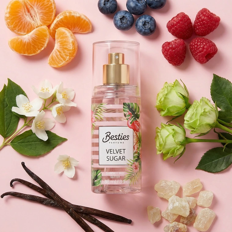 Парфюмированный мист для тела BESTIES Shimmer Mist Velvet Sugar с шиммером. Верхние ноты: мандарин, черника, малина. Средние ноты: жасмин, зеленая роза. Базовые ноты: мускус, ваниль.