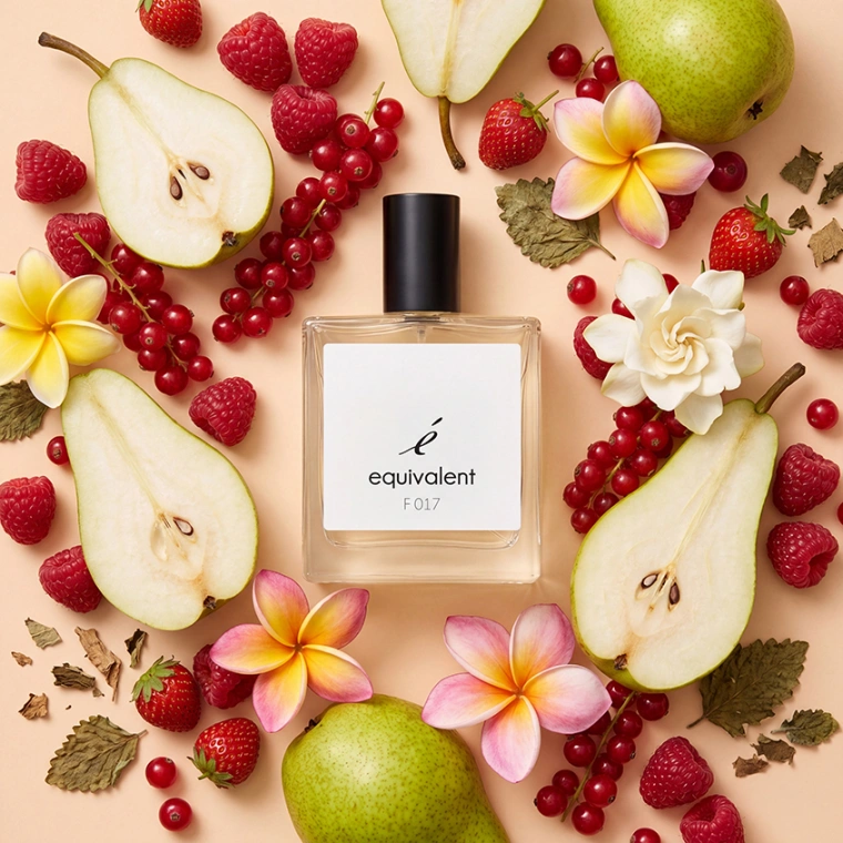 EQUIVALENT F017 - аромат нежности, женственности, изящности. Это глубокая, утонченная, обволакивающая парфюмерная композиция, в которой свежесть, сочность и сладость груши и ягод переплетаются с изысканным звучанием гардении и франжипани на благородном древесном фоне. Основные ноты: груша, красные ягоды, гардения, франжипани, пачули.