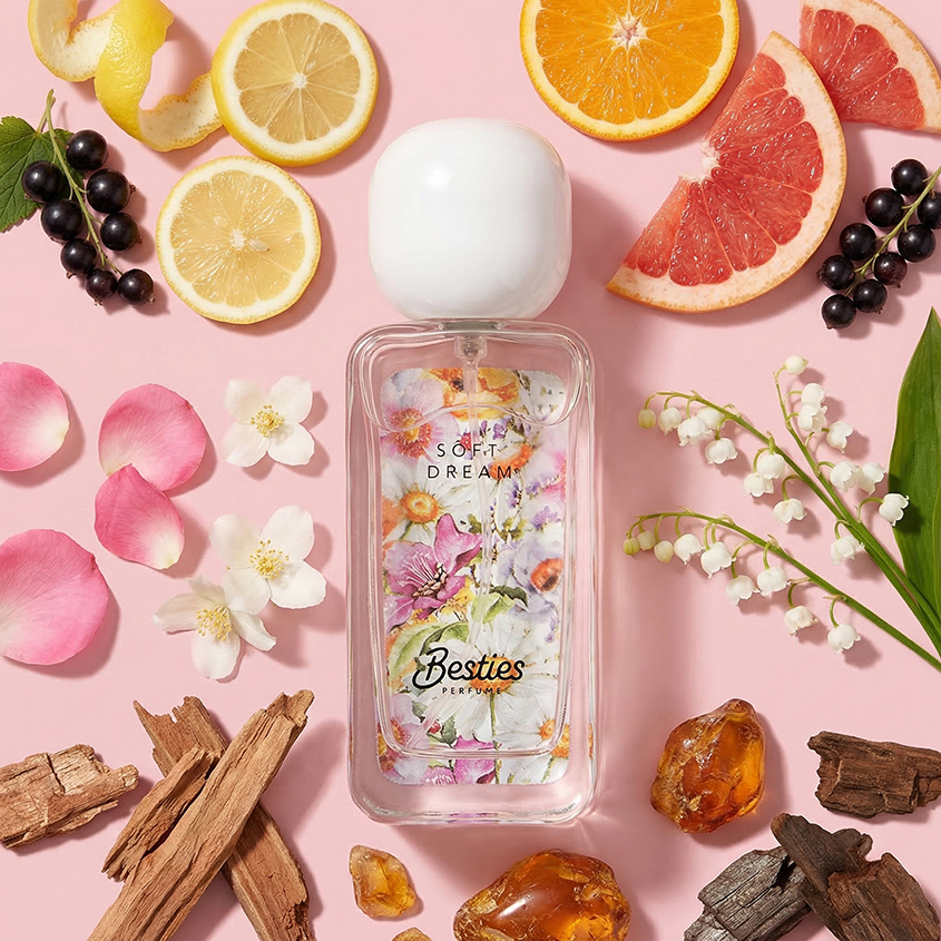 Парфюмерная вода BESTIES FLORAL COLLECTION soft dream встречает сочными цитрусовыми, которые дарят заряд невероятной бодрости и оптимизма. Теплую радость усиливают глубокие и мягкие оттенки. Ноты мускуса оставляют притягательный след и делают аромат многогранным.