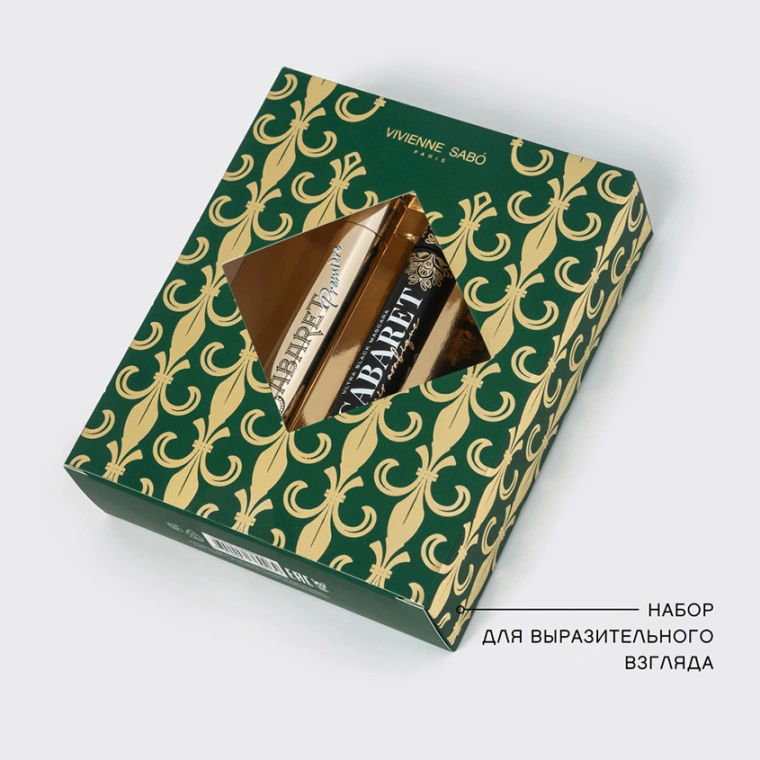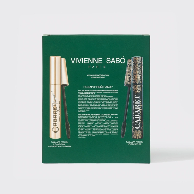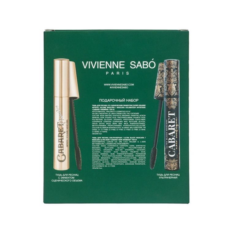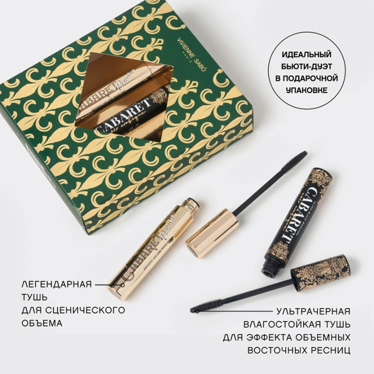 Набор VIVIENNE SABÓ для выразительного взгляда — идеальный дуэт твоих любимых бьюти-средств. Черная тушь CABARET PREMIÈRE придает ресницам сценический объем. Уникальная пластиковая щеточка с зауженным кончиком равномерно распределяет тушь по ресницам, разделяет их и добавляет густоту. CABARET NOIR ARABIQUE — самая черная и насыщенная тушь в истории VIVIENNE SABÓ в эксклюзивном флаконе с золотыми узорами. Она создает эффект объемных восточных ресниц и легко наносится без комочков зауженной пластиковой щеточкой. Ультрачерная тушь с влагостойкой формулой обволакивает ресницы, не осыпается и не оставляет следов на коже даже в самом жарком климате, а во время демакияжа легко смывается с ресниц «чулочками» теплой водой. Порадуй набором VIVIENNE SABÓ в подарочной упаковке себя и близких!