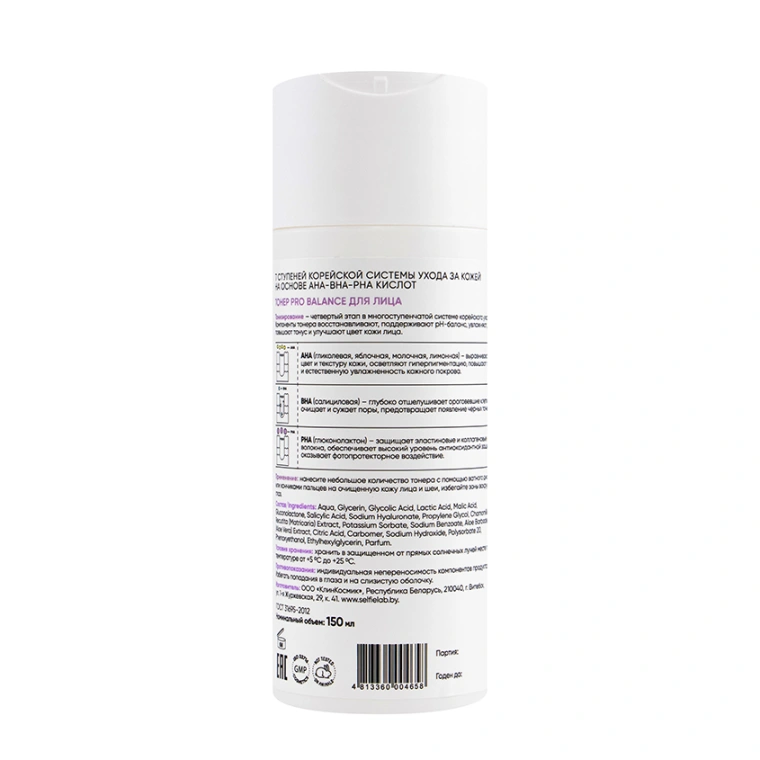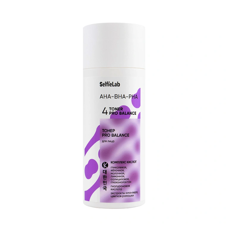 7 ступеней корейской системы ухода за кожей на основе AHA-BHA-PHA кислот. Тонизирование – четвертый этап в многоступенчатой системе корейского ухода. Компоненты тонера восстанавливают, поддерживают pH-баланс, увлажняют, повышают тонус и улучшают цвет кожи лица. Кислоты: AHA (гликолевая, яблочная, молочная, лимонная) - выравнивают цвет и текстуру кожи, осветляют гиперпигментацию, повышают тонус и естественную увлажнённость кожного покрова. BHA (салициловая) - глубоко отшелушивает ороговевшие клетки, очищает и сужает поры, предотвращает появление чёрных точек. PHA (глюконолактон) - защищает эластиновые и коллагеновые волокна, обеспечивает высокий уровень антиоксидантной защиты, оказывает фотопротекторное воздействие. Дополнительные активные компоненты:экстракты алоэ вера и цветков ромашки.