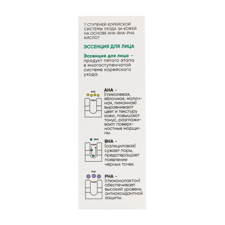 7 ступеней корейской системы ухода за кожей на основе AHA-BHA-PHA кислот. Эссенция для лица – продукт пятого этапа в многоступенчатой системе корейского ухода. Эссенция для лица, компоненты которой эффективно работают с ороговевшими клетками эпидермиса, способствуют уменьшению жирного блеска и сужению пор, Сокращают пигментацию, осветляют и улучшают тон кожи.