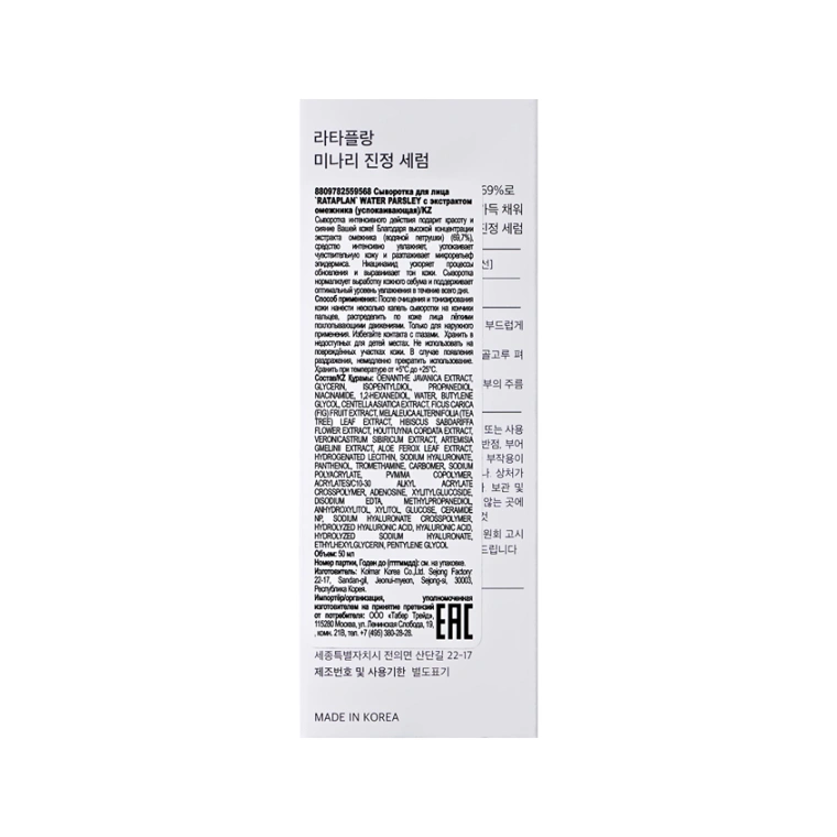 Успокаивающая сыворотка для лица RATAPLAN Water Parsley с экстрактом омежника интенсивно увлажняет, разглаживает микрорельеф и нормализует выработку себума. Хауттюйния защищает от свободных радикалов, замедляя процессы старения. Экстракт центеллы азиатской уменьшает покраснения, снимает зуд и раздражение. Ниацинамид ускоряет процессы обновления и выравнивает тон кожи. Алоэ вера ускоряет регенерацию, способствуя обновлению клеток. Пантенол восстанавливает гидролипидный баланс, защищает кожу от вредного воздействия окружающей среды. Сыворотка для лица RATAPLAN Water Parsley подходит для всех типов кожи.