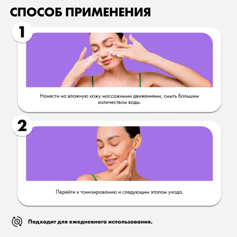 1. Нанести на влажную кожу массажными движениями, смыть большим количеством воды. 2. Перейти к