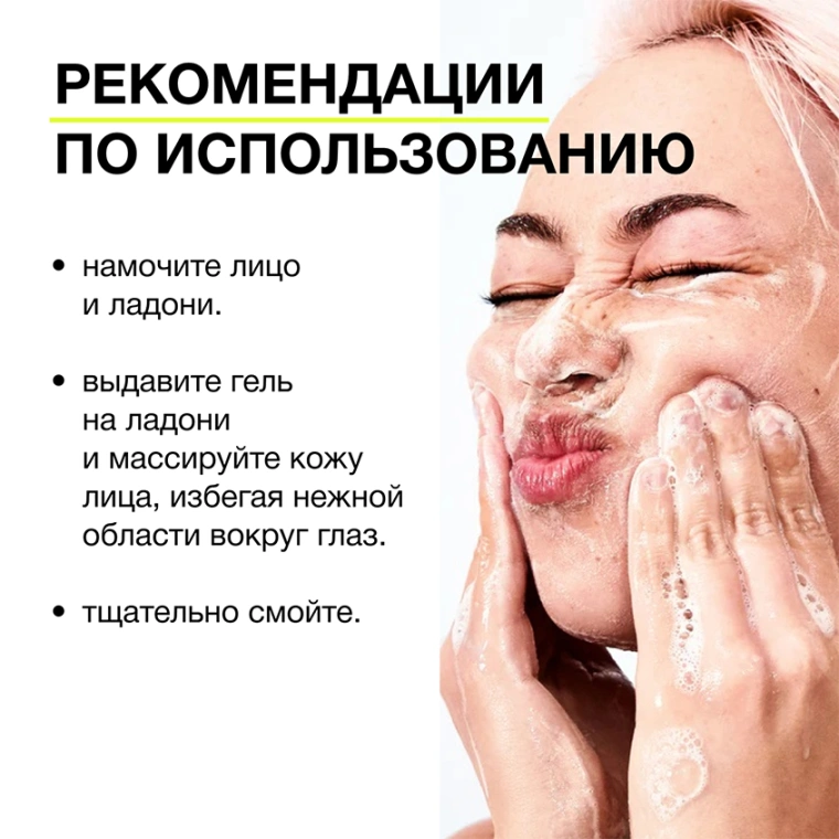 Намочите лицо и ладони. Выдавите гель на ладони и массируйте кожу лица, избегая нежной области