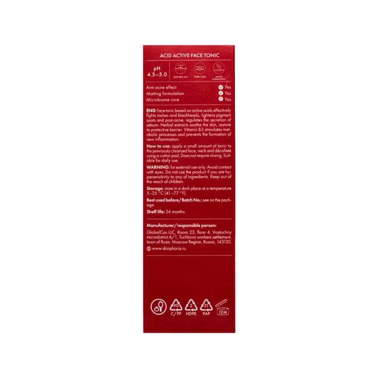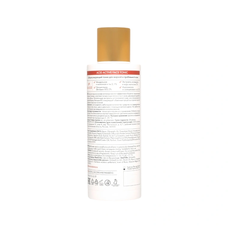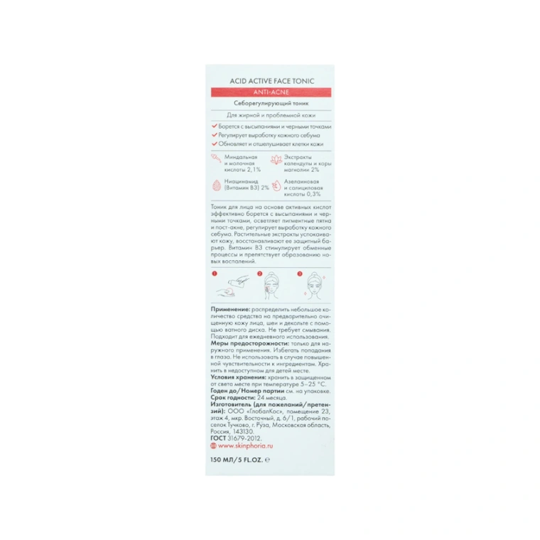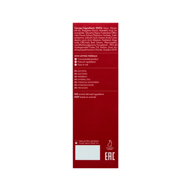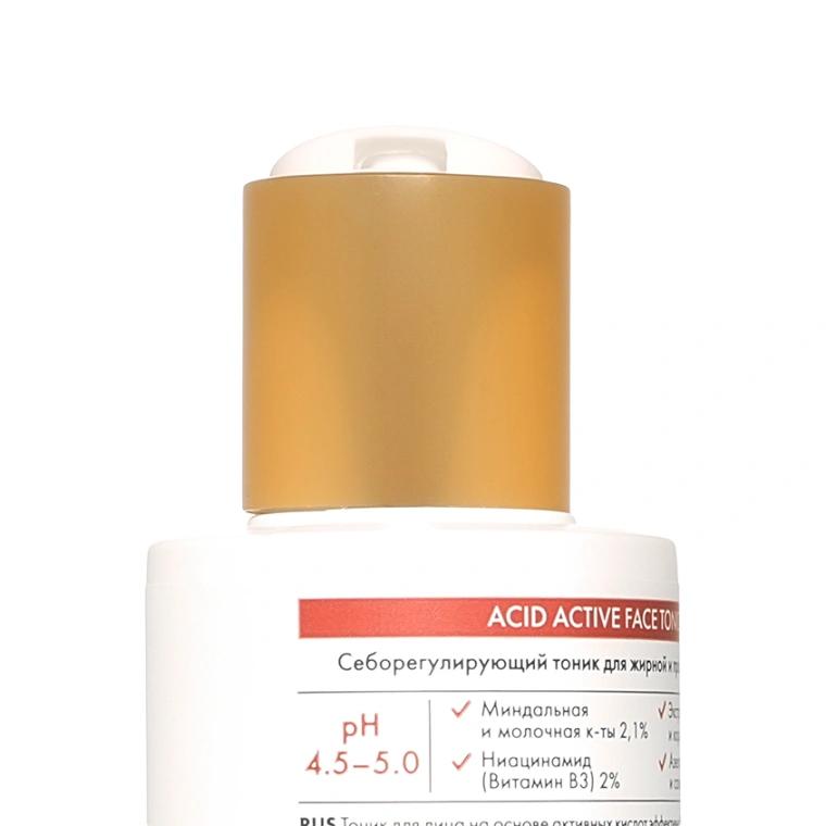 Тоник для лица на основе активных кислот эффективно борется с высыпаниями и черными точками, осветляет пигментные пятна и пост-акне, регулирует выработку кожного себума. Растительные экстракты успокаивают кожу, восстанавливают ее защитный барьер. Витамин В3 стимулирует обменные процессы и препятствует образованию новых воспалений.