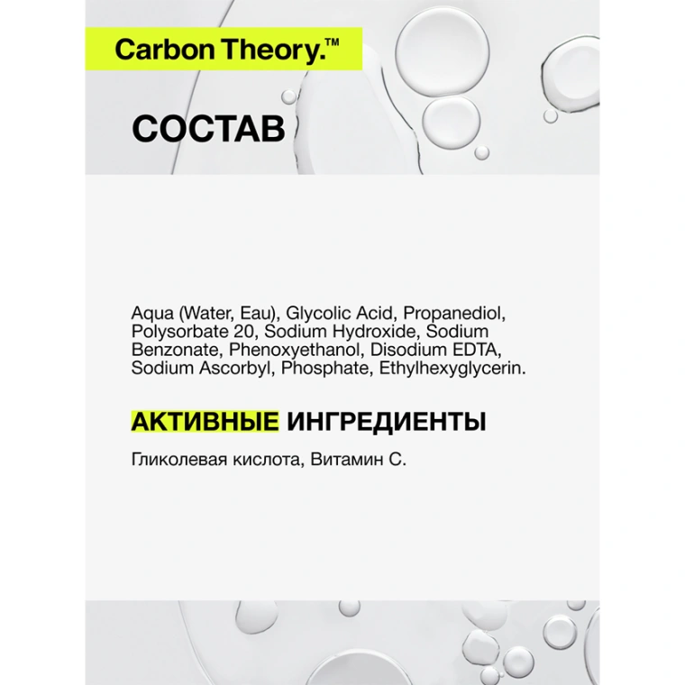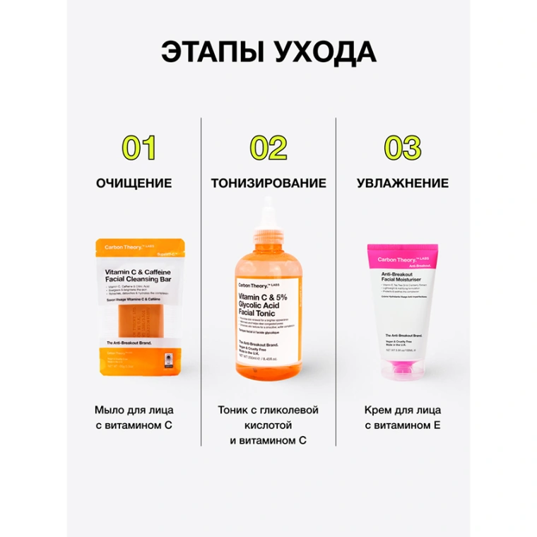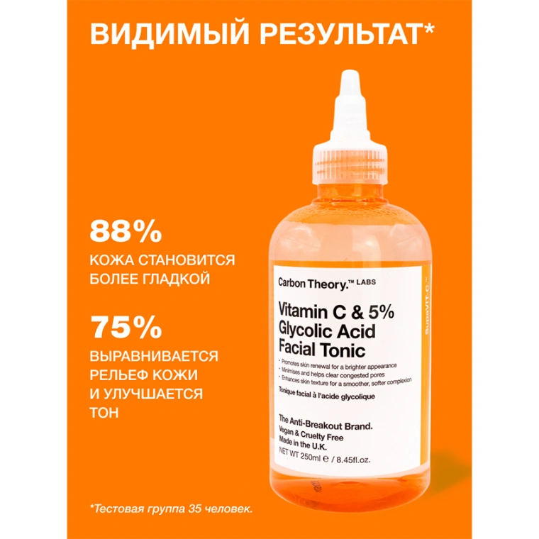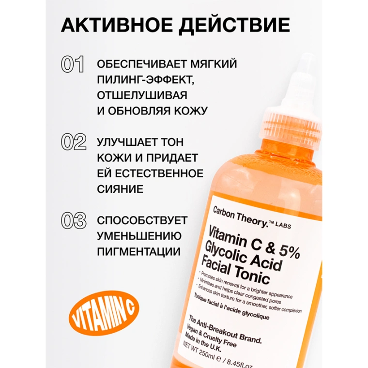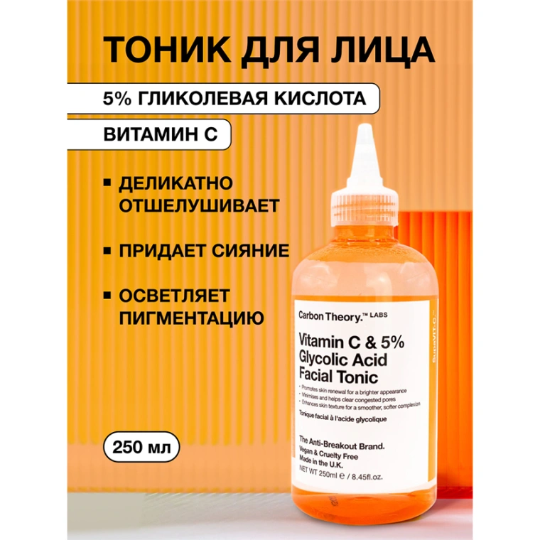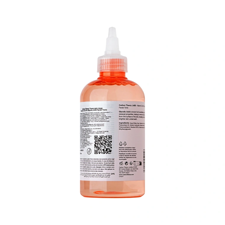 Тоник для лица CARBON THEORY SUPAVIT-C с 5% гликолевой кислотой и витамином C — это ежедневное средство для мягкого обновления кожи, выравнивания тона и восстановления здорового сияния. Идеально подходит для тусклой, уставшей кожи, склонной к высыпаниям и неровностям. Гликолевая кислота 5% деликатно отшелушивает ороговевшие клетки, улучшает текстуру кожи и способствует обновлению. Витамин C борется с тусклостью, укрепляет защитные функции кожи, осветляет пигментацию и следы от акне. Ниацинамид выравнивает тон, сужает поры и регулирует выработку себума.