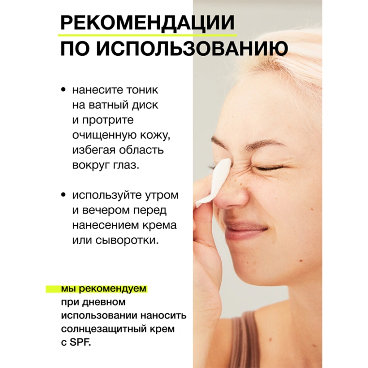 Протереть очищенную кожу ватным диском с тоником, избегая область вокруг глаз, а также раздраженные