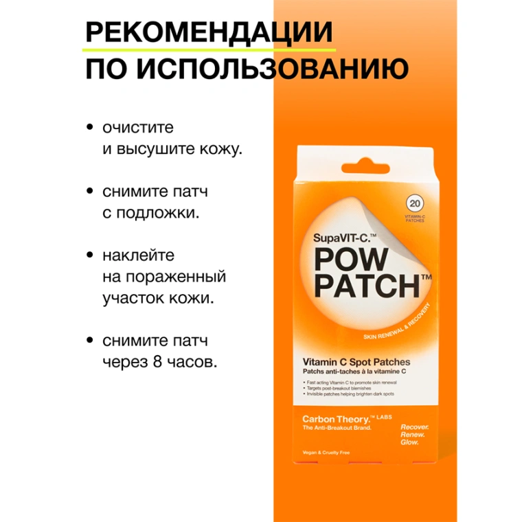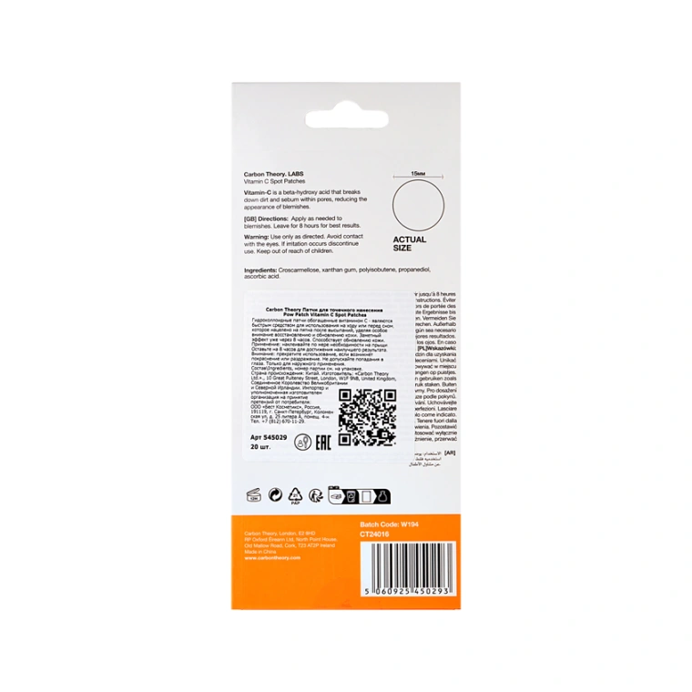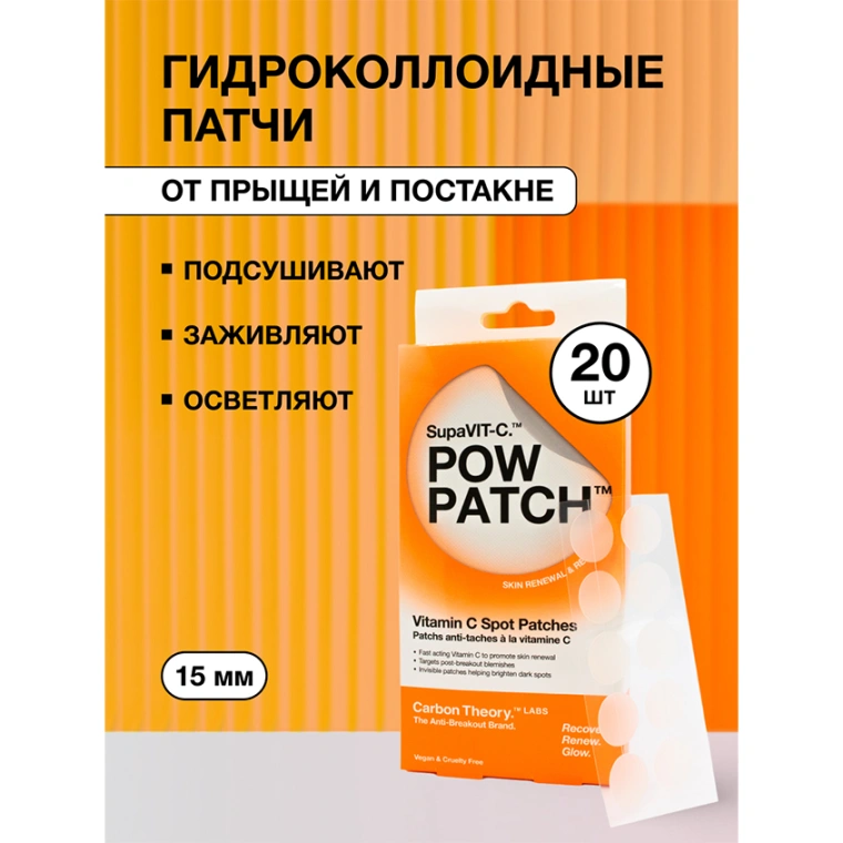 Гидроколлоидные патчи CARBON THEORY с витамином C SUPAVIT-C Spot Patches — это удобное и эффективное средство точечного действия для борьбы с воспалениями, тусклостью и пост-акне. Их можно использовать как днем, так и на ночь — идеально подходят для быстрого восстановления кожи. Витамин C — мощный антиоксидант, выравнивает тон кожи, уменьшает видимость пост-акне и борется с пигментацией. Ниацинамид помогает сократить поры, регулирует выработку себума и усиливает барьерную функцию кожи. Гидроколлоидная основа впитывает излишки себума, защищает воспаленный участок от внешних факторов и способствует быстрому заживлению.