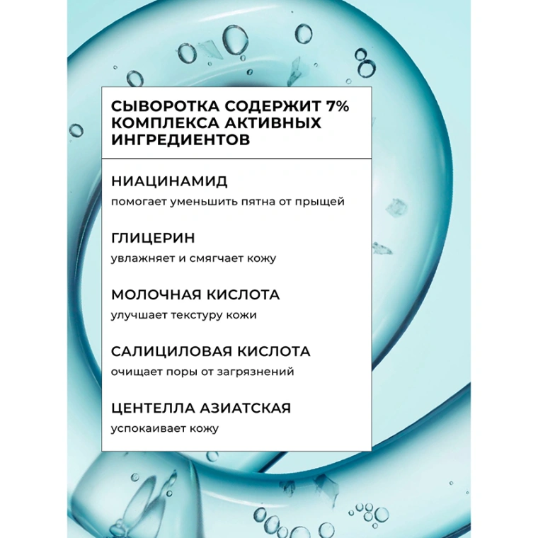 Ниацинамид помогает уменьшить пятна от прыщей, а глицерин обеспечивает увлажнение и смягчение, оставляя кожу мягкой и комфортной.