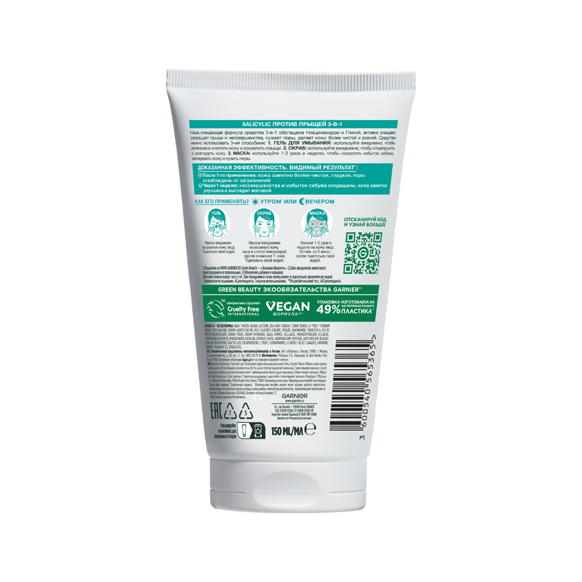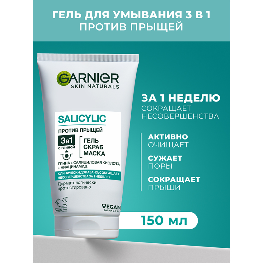Garnier 3-в-1 «Гель + Скраб + Маска» с глиной — это мультифункциональное средство, которое объединяет сразу три этапа ухода, направленных против прыщей, черных точек и жирного блеска. Благодаря многофункциональной формуле средство подходит для ежедневного использования в качестве геля для умывания, скраба для глубокого очищения и отшелушивания, а также маски для интенсивного ухода и матирования кожи.