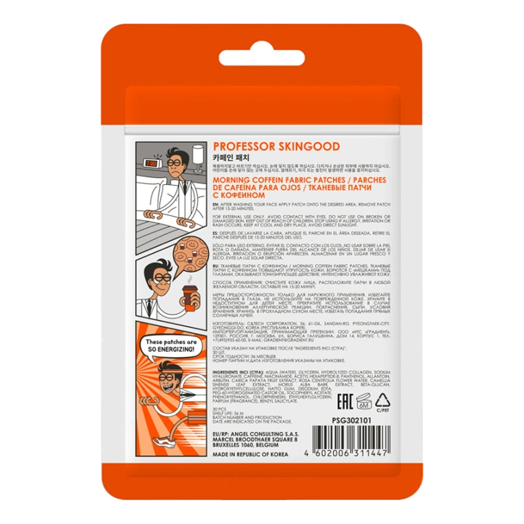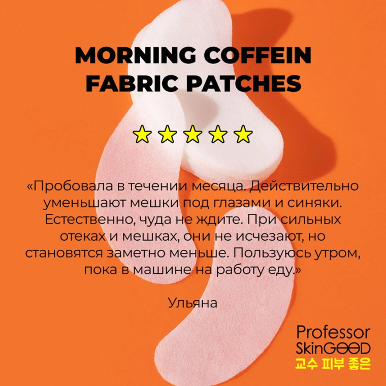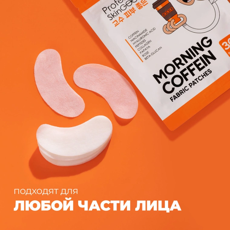 Тканевые патчи с кофеином повышают упругость кожи, борются с «мешками» под глазами, оказывают тонизирующее действие, интенсивно увлажняют кожу. В 1 упаковке 30 патчей (15 пар) по цене 1 пары! Патчи являются многофункциональными - их можно наклеивать на любую часть лица: носогубные морщины, лоб, щеки, под глаза и подбородок. Упаковка Zip-lock удобна при путешествии, а также предотвращает преждевременное высыхание патчей. Устранение отечности, разглаживание морщин. Кофеин обладает лимфодренажным действием: убирает отечность, придает коже тонус, локально борется с жировыми отложениями. Ниацинамид – это водорастворимый витамин группы В, который способствует укреплению гидролипидного барьера кожи, осветляет ее и улучшает внешний вид. Гиалуроновая кислота и коллаген сохраняют влагу во всех слоях кожи, разглаживают и повышают упругость кожи, пептиды помогают расслабить мышцы лица и при этом разгладить морщины. Папаин мягко отшелушивает нежную кожу вокруг глаз, способствуя улучшению цвета и рельефа кожи, и ускоряет процессы обновления клеток. Регенерация и иммунитет кожи. Экстракт розы обладает тонизирующим действием и активно увлажняет кожу, а бета-глюкан стимулирует иммунитет кожи на уровне микробиома.