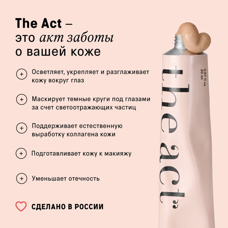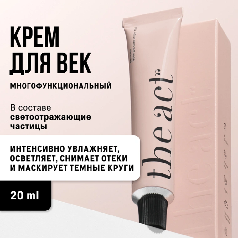 Многофункциональный крем для зоны вокруг глаз The Act осветляет, укрепляет и разглаживает кожу, уменьшает отечность, поддерживает естественную выработку коллагена, маскирует темные круги и подготавливает к макияжу.
