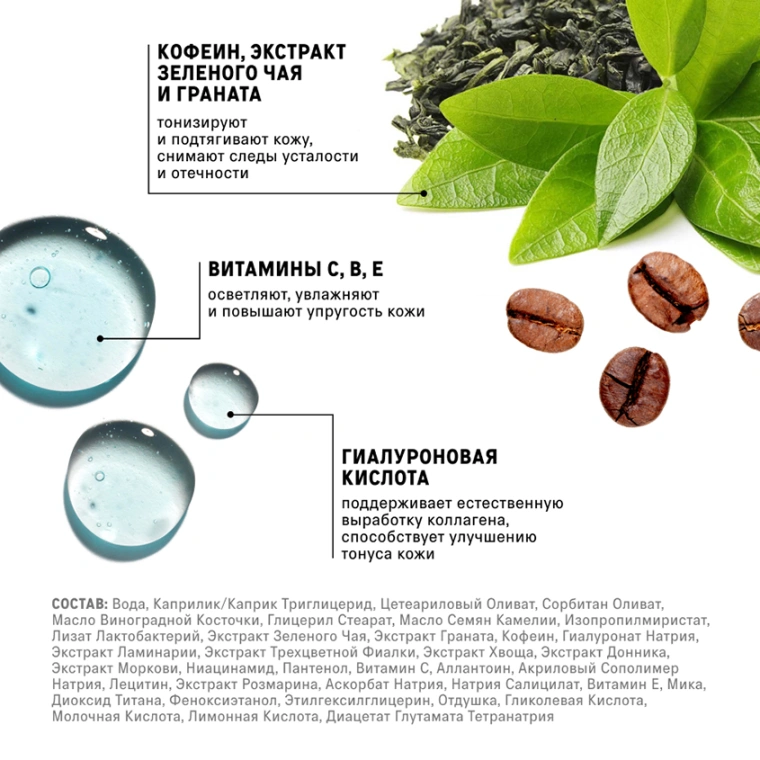 Aqua (Water), Caprylic/Capric Triglyceride, Glycerin, Glyceryl Stearate, Cetearyl Olivate, Sorbitan Olivate, Panthenol, Ethyl Panthenol, Niacinamide, Ascorbic Acid, Sodium Ascorbate, Sodium Salicylate, Citric Acid, Glycolic Acid, Lactic Acid, Sodium Hyaluronate, Isopropyl Myristate, Simmondsia Chinensis (Jojoba) Seed Oil, Trehalose, Lactobacillus Ferment Lysate, Camellia Sinensis (Green Tea) Leaf Extract, Punica Granatum (Pomegranate) Extract, Caffeine, Mica, Titanium Dioxide, Hematite, Benzyl Alcohol, Ethylhexylglycerin, Laminaria Digitata (Horsetail Kelp) Extract, Viola Tricolor (Violet) Extract, Equisetum Arvense (Horsetail) Extract, Melilotus Officinalis (Clover) Herb Extract, Daucus Carota Sativa (Carrot) Seed Extract, Sodium Acrylates Copolymer, Lecithin, Tocopheryl Acetate, Ascorbyl Palmitate, Tetrasodium Glutamate Diacetate, Chlorphenesin, Fragrance