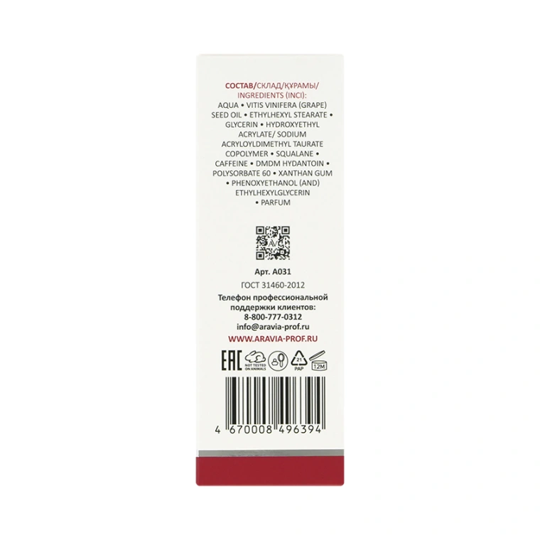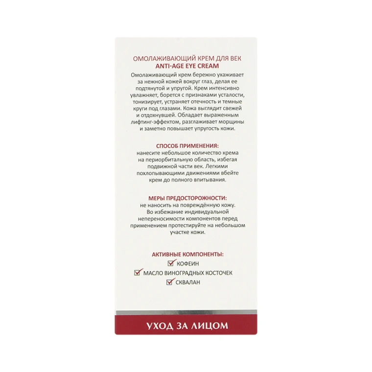 Аqua, Vitis Vinifera (Grape) Seed Oil, Ethylhexyl Stearate, Glycerin, Hydroxyethyl Acrylate/Sodium Acryloyldimethyl Taurate Copolymer, Squalane, Caffeine, DMDM Hydantoin, Polysorbate 60, Xanthan Gum, Phenoxyethanol (And) Ethylhexylglycerin, Parfum.