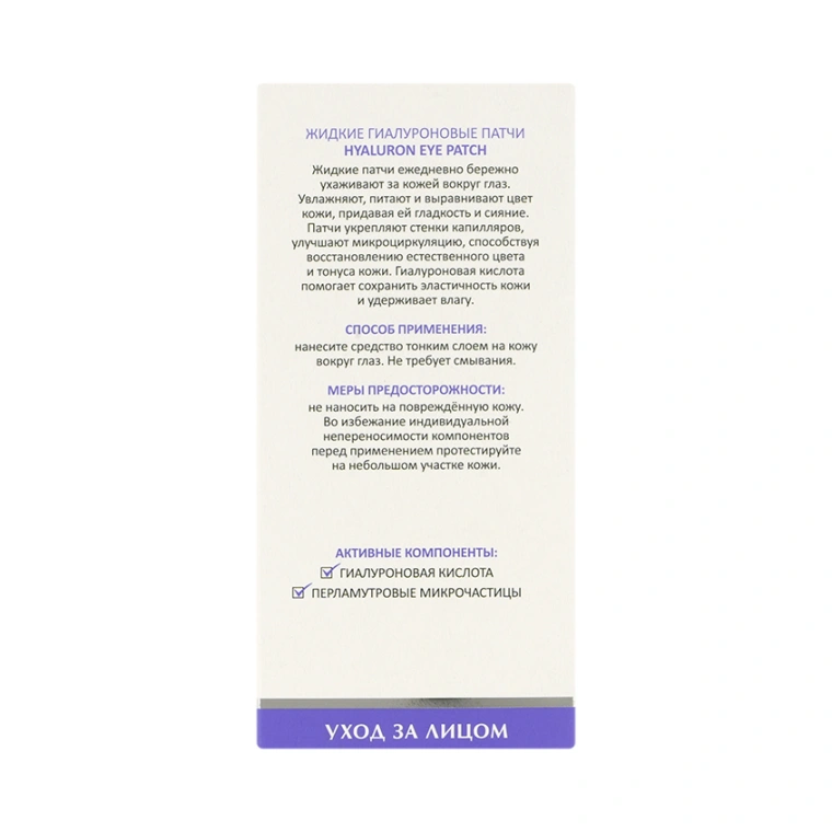 Жидкие патчи ежедневно бережно ухаживают за кожей вокруг глаз, делая её гладкой и упругой. Увлажняют и питают, выравнивают цвет кожи, делая её свежей и сияющей. Патчи укрепляют стенки капилляров, улучшают микроциркуляцию, способствуя восстановлению естественного цвета и тонуса кожи. Гиалуроновая кислота помогает сохранить эластичность кожи и удерживает влагу.
