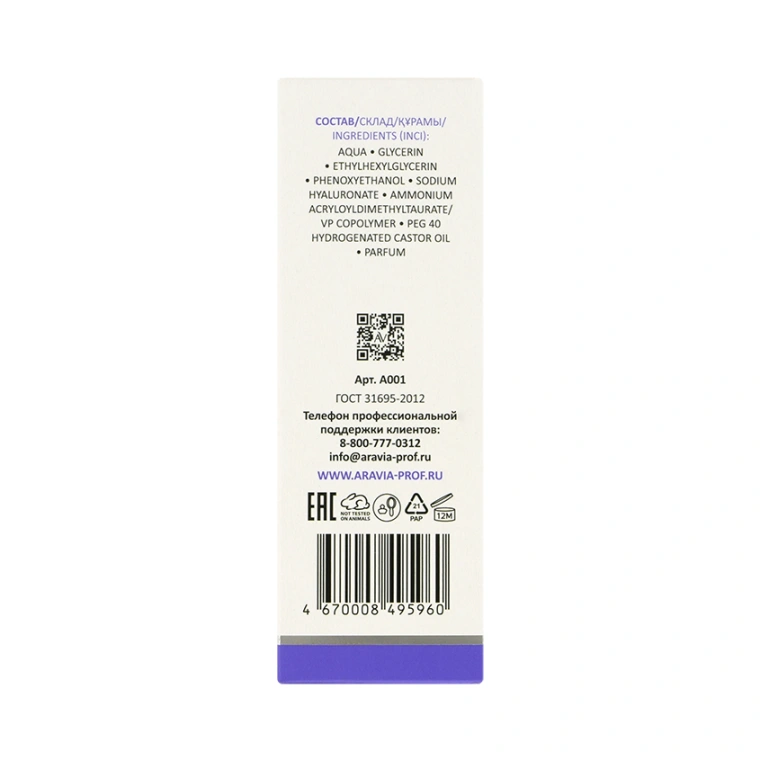 Аqua, Glycerin, Ethylhexylglycerin, Phenoxyethanol, Sodium Hyaluronate, Ammonium Acryloyldimethyltaurate/VP Copolymer, PEG 40 Hydrogenated Castor Oil, Parfum.