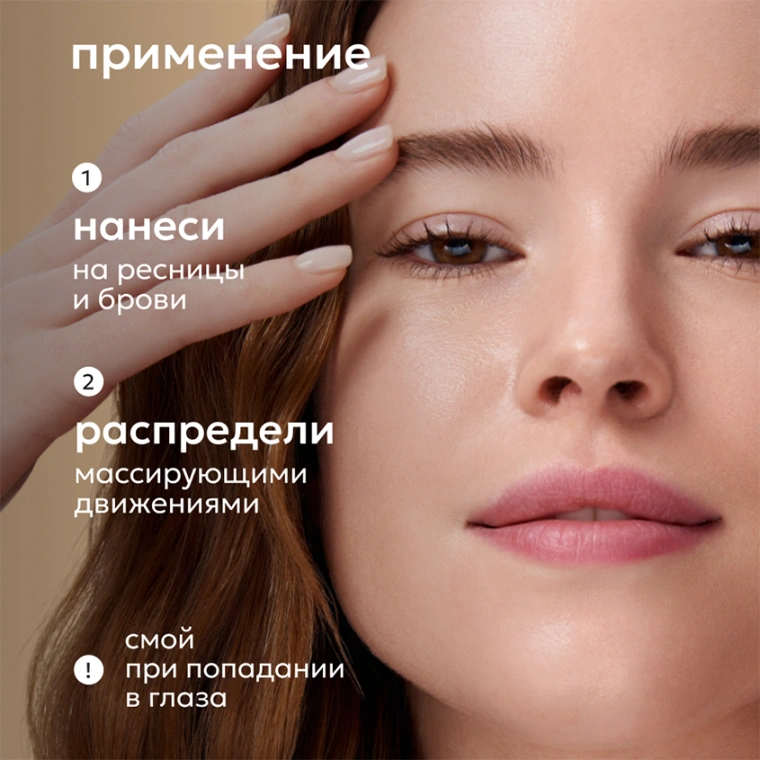 Способ применения: нанести обильное количество средства на очищенные ресницы и брови массирующими