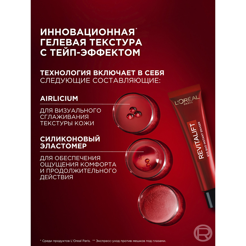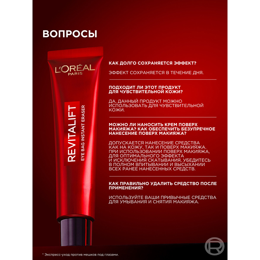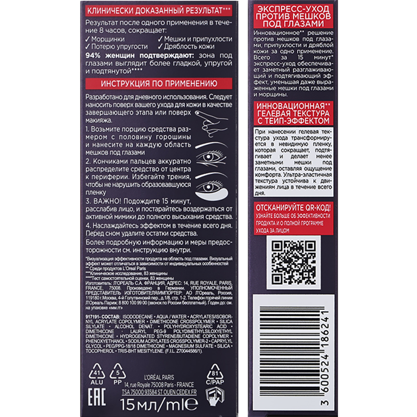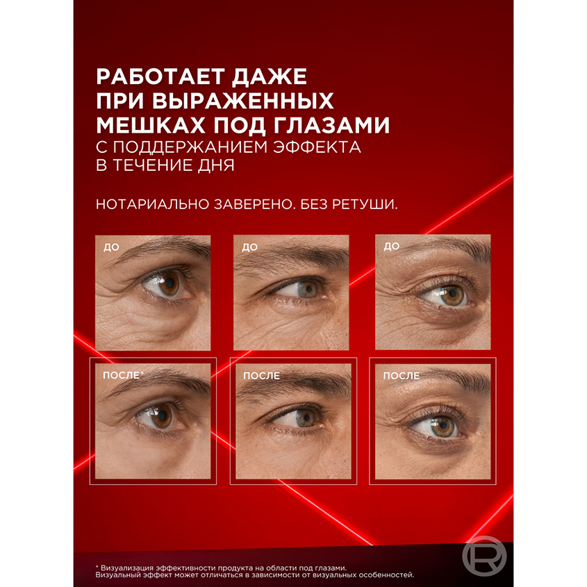 Инновационное* решение против мешков под глазами, припухлости и дряблой кожи за одно применение. Всего за 15 минут** экспресс-уход обеспечивает заметный разглаживающий и подтягивающий эффект, уменьшая даже выраженные мешки под глазами и морщины.
