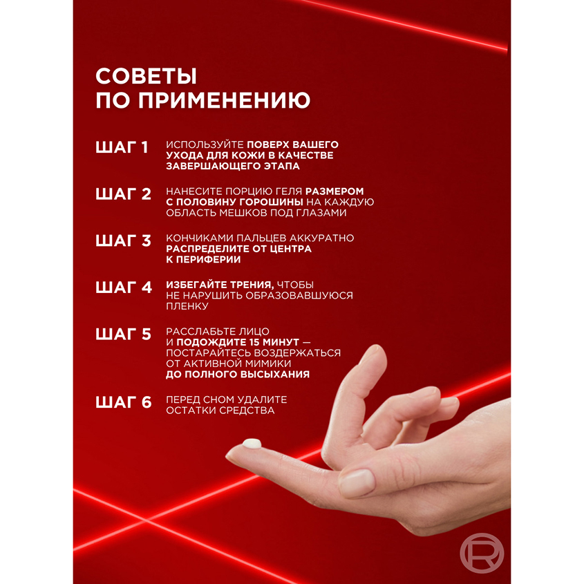 ухода для кожи в качестве завершающего этапа. 1.Возьмите порцию средства размером с половину горошины и нанесите на каждую область мешков под глазами 2.Кончиками пальцев аккуратно распределите средство от центра к периферии Избегайте трения, чтобы не нарушить образовавшуюся пленку 3.ВАЖНО! Подождите 15 минут, расслабив лицо, и постарайтесь воздержаться от активной мимики до полного высыхания средства 4.Наслаждайтесь эффектом в течение всего дня. Перед сном удалите остатки средства.