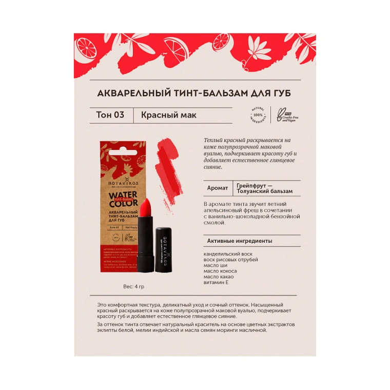 Теплый красный раскрывается на коже полупрозрачной маковой вуалью, подчеркивает красоту губ и добавляет естественное глянцевое сияние.
