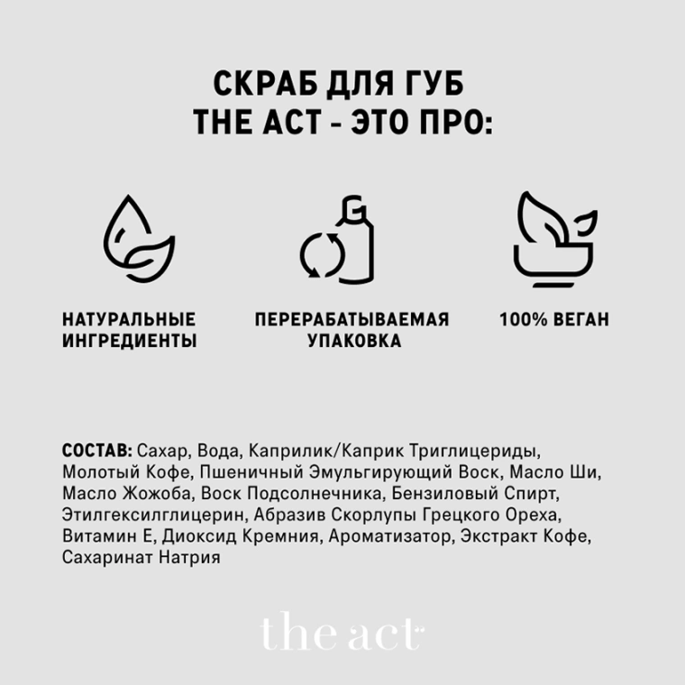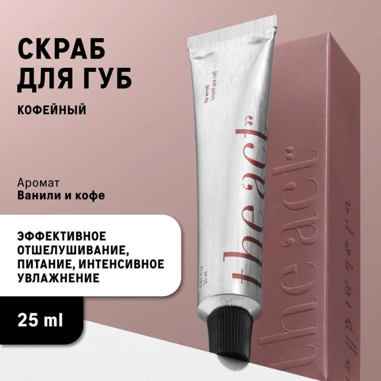 Первый этап грамотного ухода за кожей губ — скрабирование. Деликатное, чтобы не повредить и без того нежные губы. Эффективное: такое, чтобы удалить ороговевшие клетки кожи. И, конечно, аппетитное. Скраб для губ от The Act соответствует всем этим требованиям: за обновление кожи отвечает абразив грецкого ореха, за питание — масла ши и жожоба, а за кондитерский аромат — ваниль и кофе.