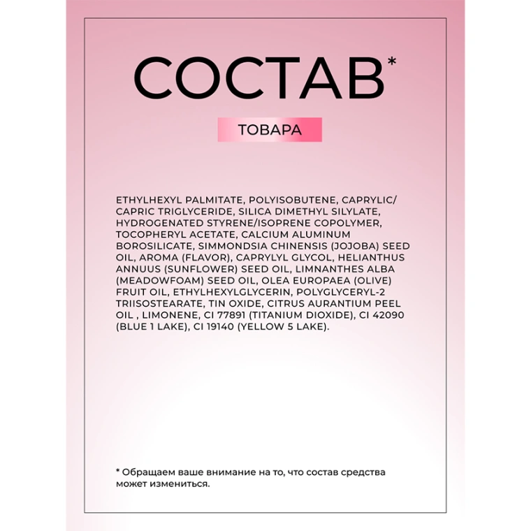 ETHYLHEXYL PALMITATE, POLYISOBUTENE, CAPRYLIC/CAPRIC TRIGLYCERIDE, SILICA DIMETHYL SILYLATE, HYDROGENATED STYRENE/ISOPRENE COPOLYMER, TOCOPHERYL ACETATE, CALCIUM ALUMINUM BOROSILICATE, SIMMONDSIA CHINENSIS (JOJOBA) SEED OIL, AROMA (FLAVOR), CAPRYLYL GLYCOL, HELIANTHUS ANNUUS (SUNFLOWER) SEED OIL, LIMNANTHES ALBA (MEADOWFOAM) SEED OIL, OLEA EUROPAEA (OLIVE) FRUIT OIL, ETHYLHEXYLGLYCERIN, POLYGLYCERYL-2 TRIISOSTEARATE, TIN OXIDE, CITRUS AURANTIUM PEEL OIL , LIMONENE, CI 77891 (TITANIUM DIOXIDE), CI 42090 (BLUE 1 LAKE), CI 19140 (YELLOW 5 LAKE).