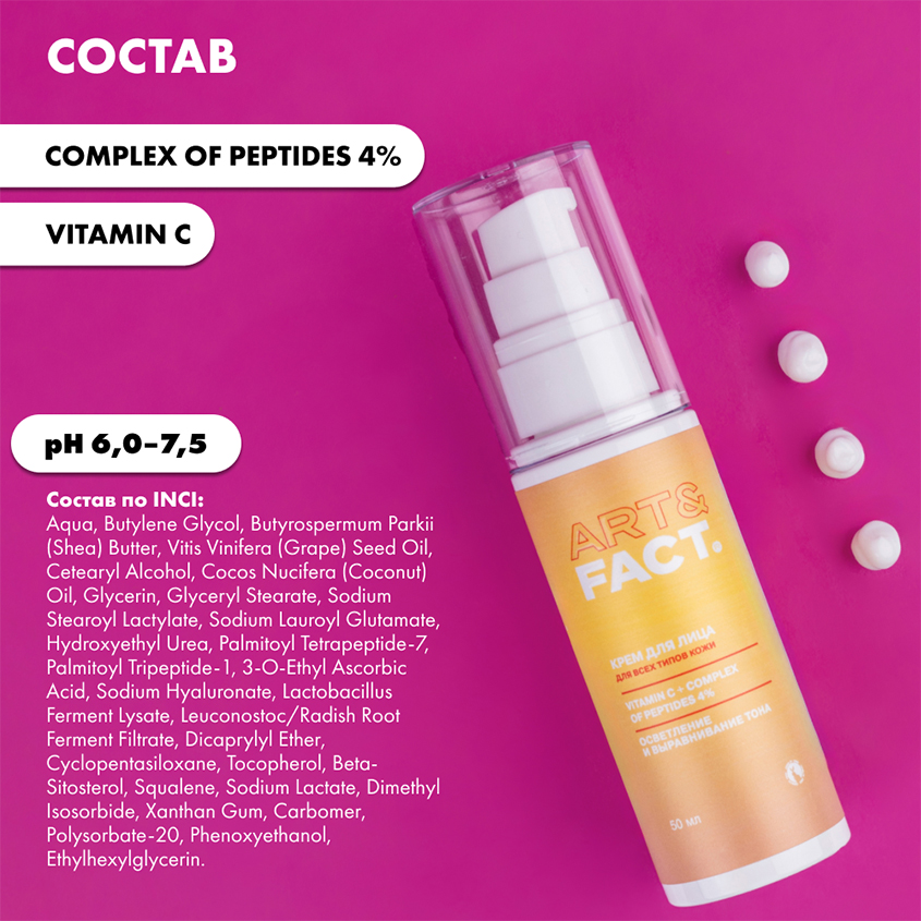 Крем с активным содержанием пептидов предназначен для ухода за возрастной и тусклой кожей. Комплекс стимулирующих пептидов способствует усилению выработки коллагена и эластина, обеспечивая лифтинг-эффект и разглаживание морщин. Стабилизированная форма витамина С придает коже сияние, свежесть и упругость, а также выравнивает тон кожи. Таким образом, крем уменьшает выраженность возрастных изменений кожи и дарит здоровый цвет лица.