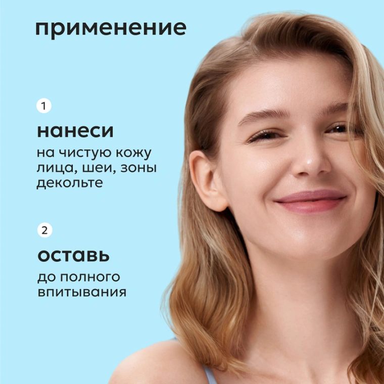 СПОСОБ ПРИМЕНЕНИЯ: НАНЕСТИ КРЕМ НА ЧИСТУЮ СУХУЮ КОЖУ ЛИЦА, ШЕИ И ЗОНЫ ДЕКОЛЬТЕ, ОСТАВИТЬ ДО ПОЛНОГО