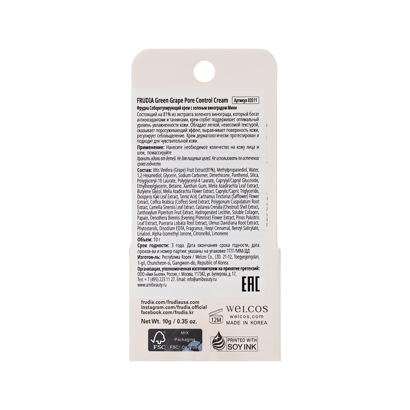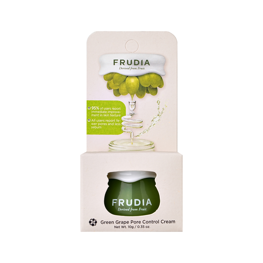 Себорегулирующий крем с зеленым виноградом Green Grape Pore Control Cream Frudia - это легкий гель, напоминающий сорбет из ягод винограда. Он моментально впитывается в кожу не оставляя липкой пленки и идеально подходит обладателям жирной, комбинированной и проблемной кожи. При создании была использована уникальная технология 48 часовой низкотемпературной экстракции, что обеспечивает более глубокое проникновение в слои эпидермиса и максимальное сохранение всех полезный питательных веществ и витаминов из фруктов. Вместо воды основу крема составляет фруктовая выжимка - 81% экстракта винограда, благодаря чему средство насыщено на антиоксиданты. Исключены все химические элементы, вредные для кожи, что сводит к минимуму возможность появления раздражений на коже. Крем помогает сократить жирность кожи, способствует сужение пор, устраняет воспаления, обеспечивает необходимое увлажнение не пересушивая. Мини-формат идеально подходит для первого знакомства с продуктом и использования любимого крема в поездках.