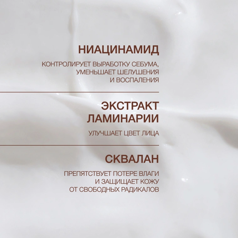Экстракт ламинарии, богатый минералами и микроэлементами, освежает цвет лица. Сквалан, природный компонент липидной мантии, предотвращает потерю влаги, обладает антиоксидантными свойствами и защищает кожу от воздействия свободных радикалов. Пантенол разглаживает кожу, повышает её упругость и эластичность. Низкомолекулярный гидролизованный коллаген стимулирует выработку собственного коллагена, укрепляя структуру кожи.
