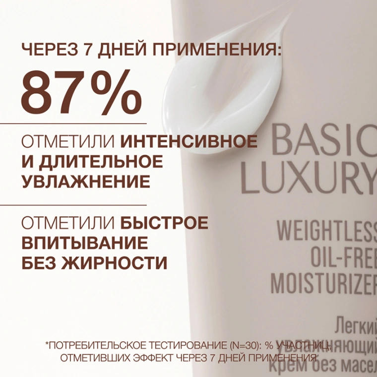 87% женщин говорят, что ощутили длительное и интенсивное увлажнение кожи уже через 7 дней применения, отмечая быстрое впитывание без чувства жирности.*