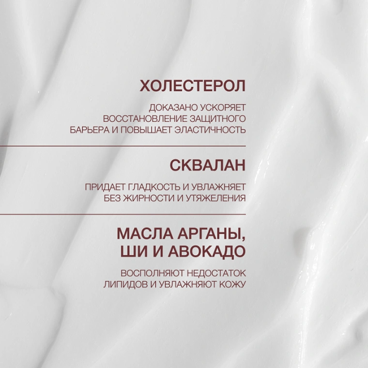 Комплекс церамидов укрепляет липидный барьер, помогает бороться с шелушениями и обезвоженностью. Холестерол ускоряет восстановление защитной функции кожи и повышает её эластичность. Сквалан из оливы предотвращает потерю влаги, делает кожу мягкой и гладкой без ощущения жирности.