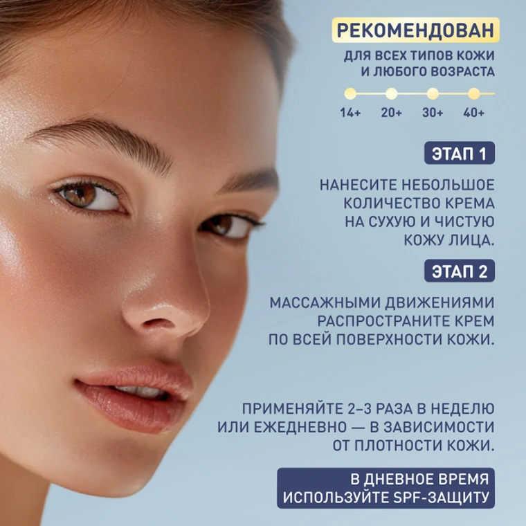 2–3 раза в неделю или ежедневно — в зависимости от плотности кожи. В дневное время используйте SPF.