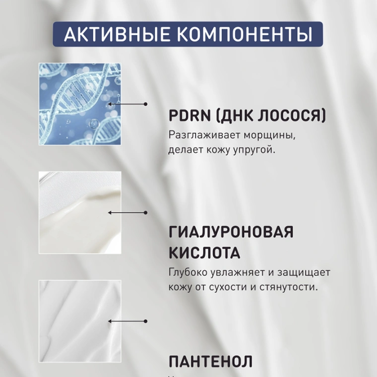 PDRN (полидезоксирибонуклеотид) насыщает кожу влагой, повышает её эластичность и помогает уменьшить выраженность морщин.