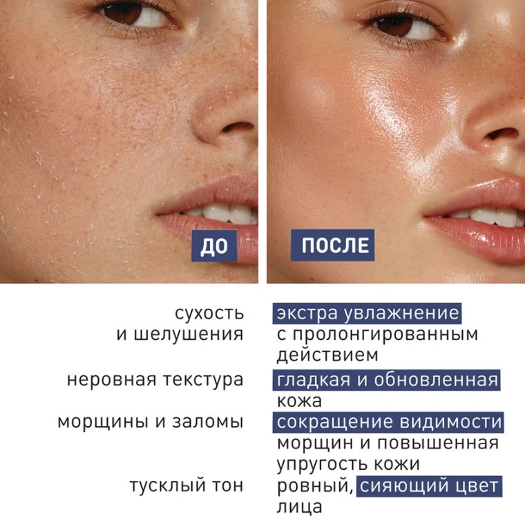 После применения кожа становится заметно более гладкой, увлажнённой и сияющей.