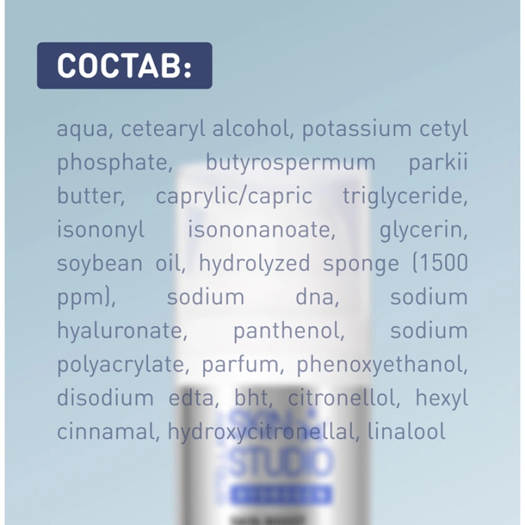 Aqua, Cetearyl Alcohol, Potassium Cetyl Phosphate, Butyrospermum Parkii Butter, Caprylic/Сapric Triglyceride, Isononyl Isononanoate, Glycerin, Soybean Oil, Hydrolyzed Sponge (1500 ppm), Sodium DNA, Sodium Hyaluronate, Panthenol, Sodium Polyacrylate, Parfum, Phenoxyethanol, Disodium EDTA, BHT, Citronellol, Hexyl Cinnamal, Hydroxycitronellal, Linalool.